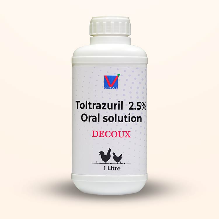 Decoux TOLTRAZURIL ORAL SOLUTION Composition: Each ml of the solution contains: Toltrazuril | 25 mg Indications/Benefits: For control and treatment of coccidiosis in poultry & swine Packaging: 1 Ltr