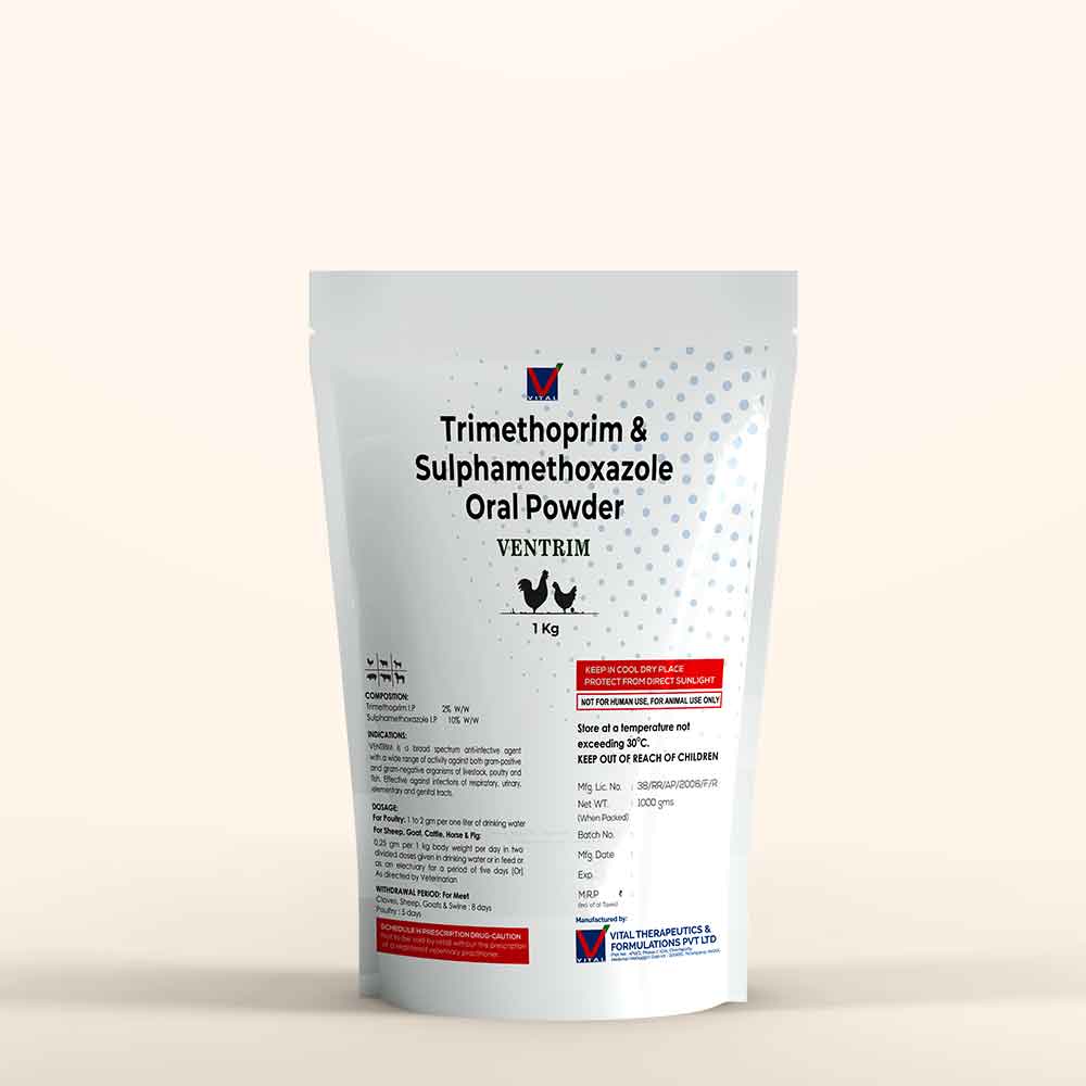Ventrim VET Trimethoprim 2% & Sulphamethoxazole 10% Oral Powder Composition: Sulphamethoxazole I.P | 10% w/w Trimethoprim I.P | 2% w/w Indications/Benefits: For Heat Stress Packaging: 1 Kg